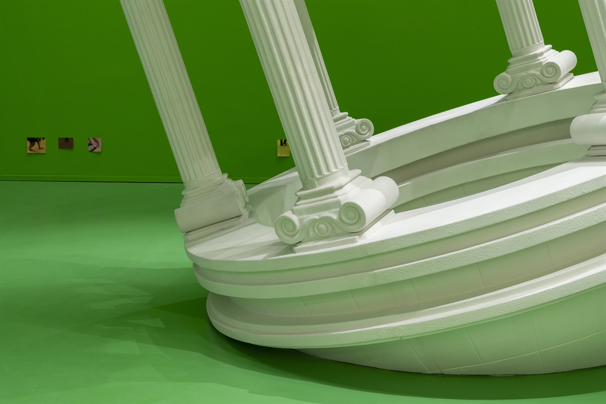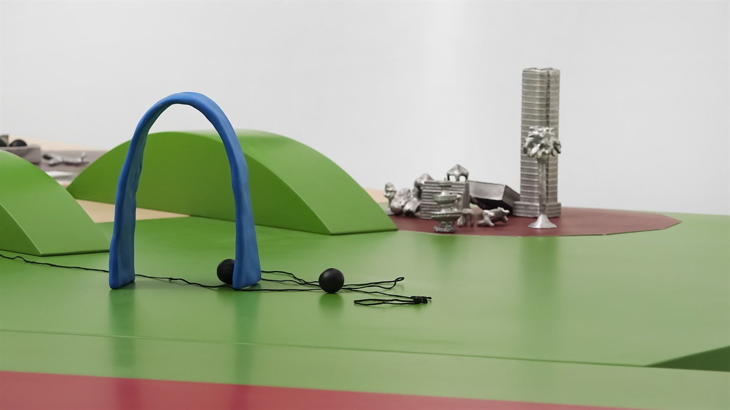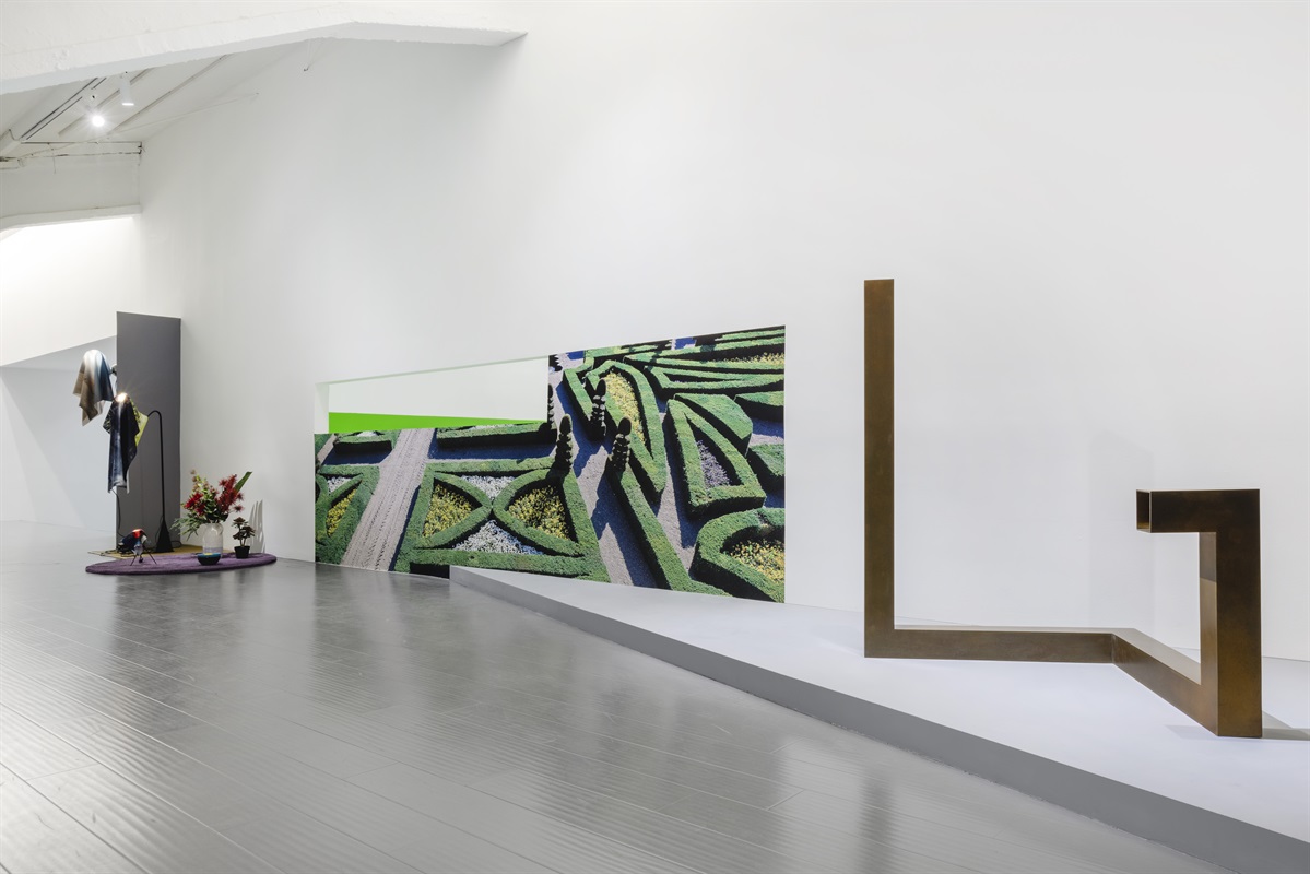 本次展览由两大主题单元构成。美术馆一层中庭呈现艺术家最新的委任雕塑装置,铺天盖地的绿幕使展厅成为一个微缩室外模拟系统,有效地打造出交互性的公共空间。在此,观众对室内空间和室外环境的体验同时存在,都市场景与乡间田野的传统分野亦受挑战。中庭既作为独立的内部空间,亦是人工制造的外部世界。一座强调公共空间与雕塑之间相互关系的纪念碑矗立于此,对立的内外经验流转其中。