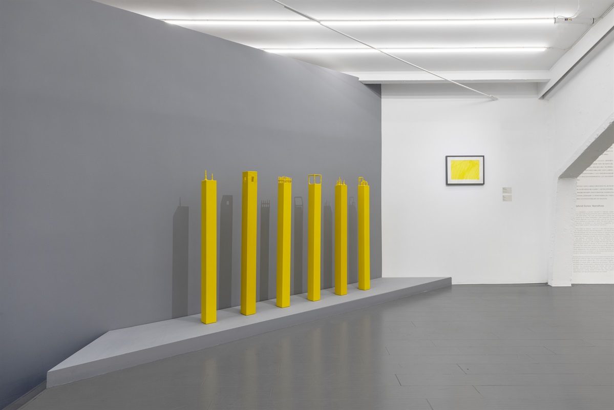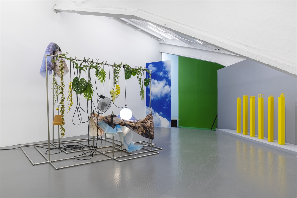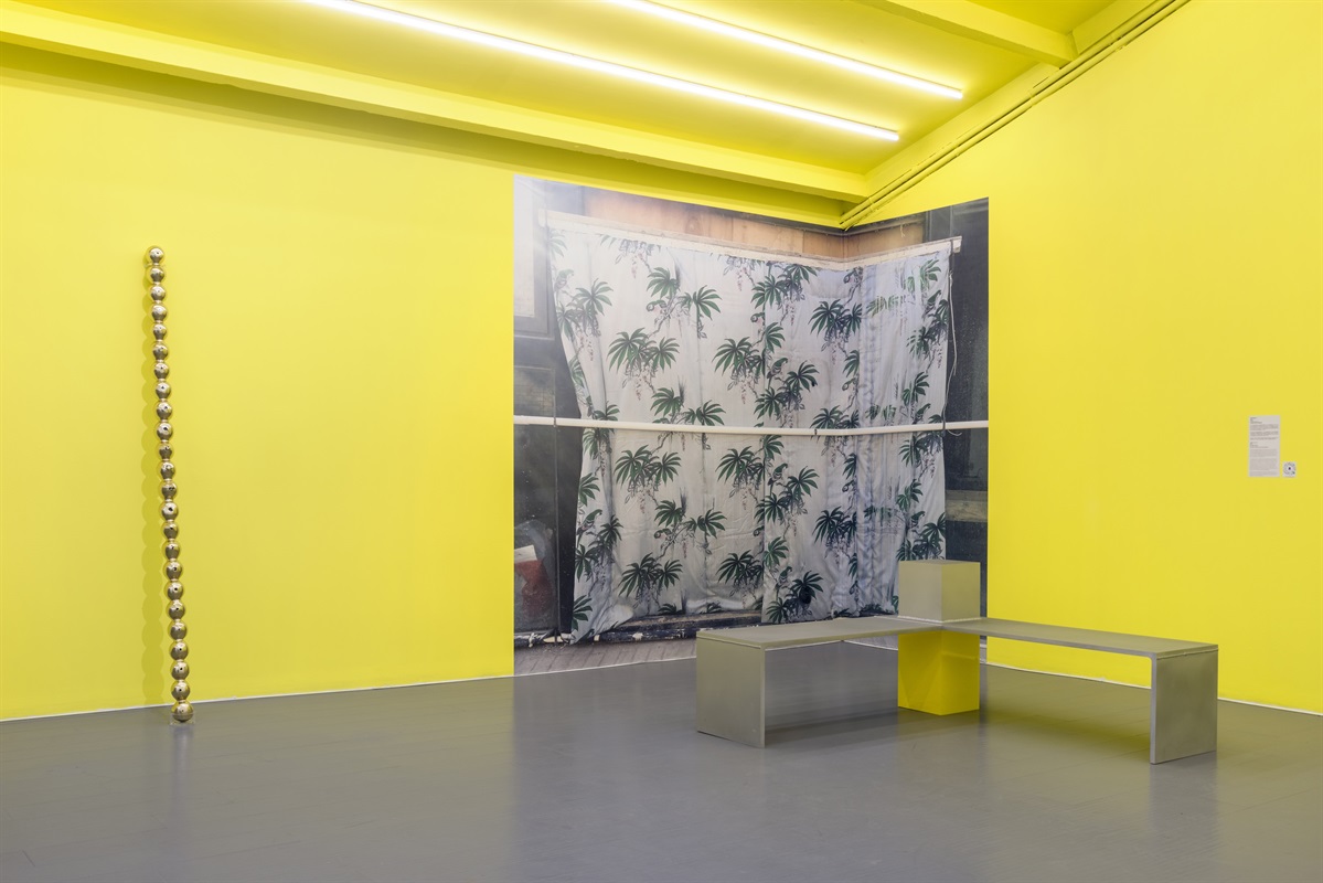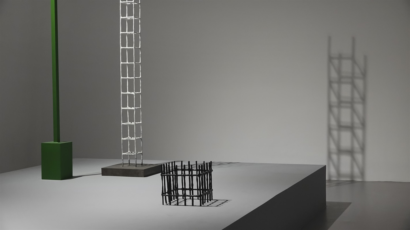 本次展览由两大主题单元构成。美术馆一层中庭呈现艺术家最新的委任雕塑装置,铺天盖地的绿幕使展厅成为一个微缩室外模拟系统,有效地打造出交互性的公共空间。在此,观众对室内空间和室外环境的体验同时存在,都市场景与乡间田野的传统分野亦受挑战。中庭既作为独立的内部空间,亦是人工制造的外部世界。一座强调公共空间与雕塑之间相互关系的纪念碑矗立于此,对立的内外经验流转其中。