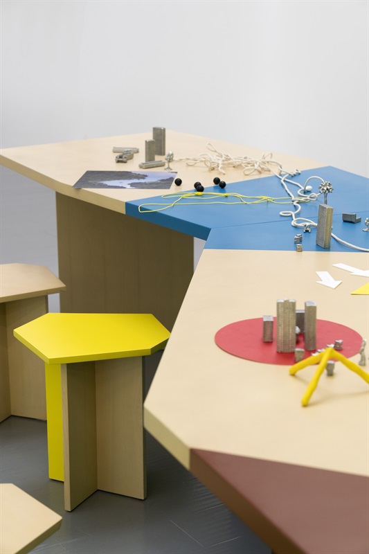 美术馆二层是娜布其十余年艺术实践的总览。该空间内的作品聚焦艺术家创作历程中首要关心的问题,例如,在制造业与批量生产主宰的时代,雕塑如何能在艺术领域坚守其独有的身份?此外,通过展现不同系列作品的多样性,展览深入探讨了艺术家对景观和自然作为雕塑实体的持续探索。展览囊括娜布其在2014年至2024年间创作的一系列䎔键作品,例如《空间外的风景》系列 (NO.1, NO.4, NO.5, NO.7-12) 。其中《空间外的风景NO.4》(2015) 和《NO.8(装在盘子 中的龟背竹)》(2022) 体现了艺术家以雕塑为媒介,尝试解读城市化自然的䐾合层次。前者是一组结构精密的不锈钢景观雕塑,引人浮想起城市天际线,提示着对生存环境的诸多思考:例如城市结构持续侵入自然景观的进程。相比2022年创作的青铜雕塑《NO.8(装在盘子中的龟背竹)》,一株碎片化的热带䇖花植物孑然孤立,其闪耀的金属辉泽凸显了龟背竹(凤梨蕉)沦为审美对象的过程。当代雕塑的刻板固化与工业化,高人气室内植物的驯化与快速栽培,二者在此被关联起来。另外,二层东展厅将呈现大型互动装置《桌面游戏:偶然事件》(2022)。该作品重视游戏性和参与度,为观众带来与作品亲身互动的体验。
