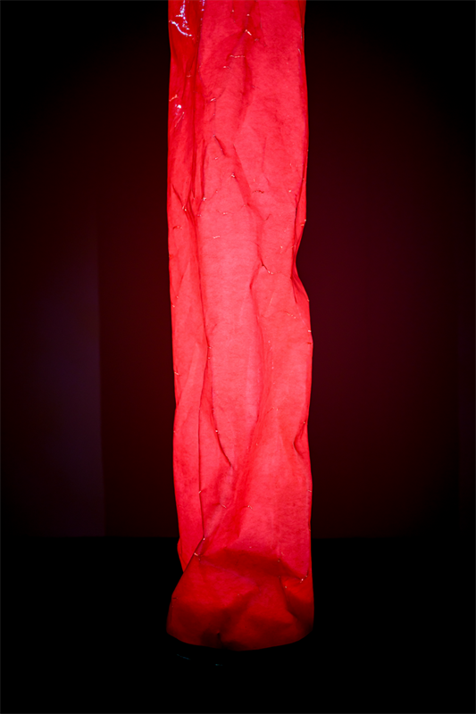 In recent years, Nabuqi has frequently used found images in her art, combining photographic and sculptural forms through either incongruous or harmonious combinations. The four works in the series “Fish finding a path ashore” continue the artist’s exploration of light sculptural forms since the exhibition “Cold Nights” in 2017, layering found images on irregular cylindrical shapes. The artist first printed the images onto archival paper, then folded them before coating a layer of clear resin over the surface to create uncanny oceanic forms that are both floppy and plumb.