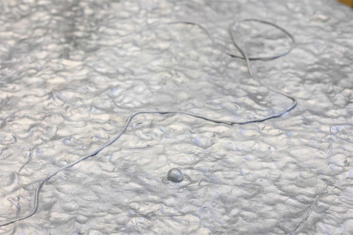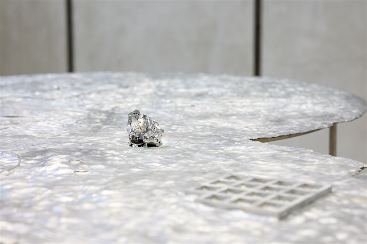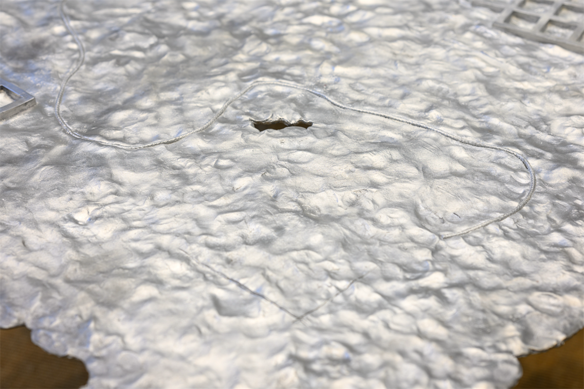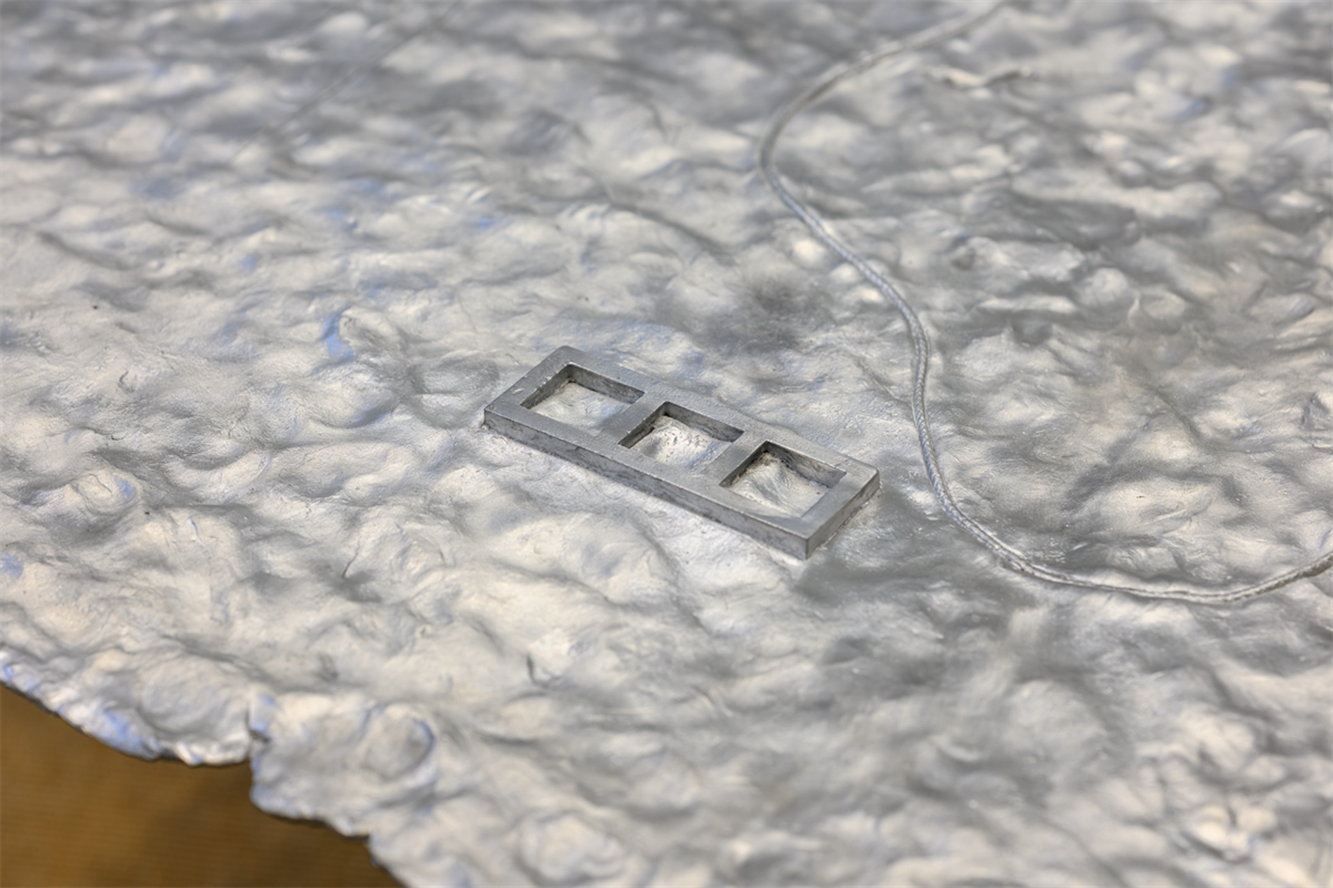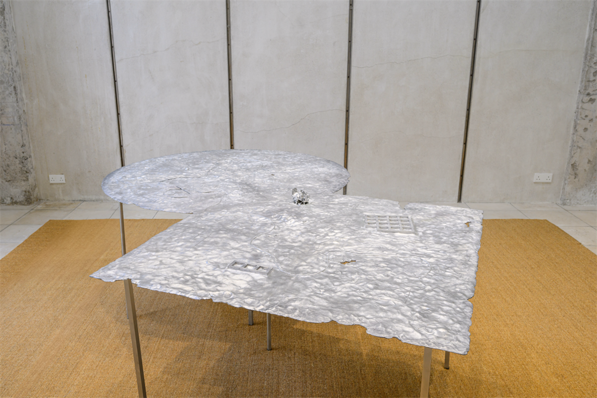In Chen’s story, the Geo-cataloguer is an eccentric specialist who documents all topographies, a patient, calm and even cruel observer of geological changes. On the esoteric map that he works upon day after day, “a stream from thousands of years ago penetrates cloud-reaching skyscrapers; an overflowing muddy swamp infested with sick flies houses a colossal, densely wired power station; a marching canal boils underneath the hustle and bustle of an urban district… Layer after layer, the topographies used to adhere fast to the earth as skins immediately attached to bodies, but are bloodily peeled off before they have fully withered.” Nabuqi’s response to this figure is Geo-cataloguer, a sculpture that is also informed by her table works shown at the Centre Pompidou x West Bund Museum Project, Shanghai in 2022. The cast aluminium sculpture, which is only 3 to 5 mm thin, represents the cryptic map in the story, an encyclopaedic chart that is at once ephemeral and unbearably voluminous. For Nabuqi, it is a surface that is “fragile and manifold, in which one casually becomes another without the possibility of definition.” The use of resin and clay in “Geopoetics regarding a waterless sea” reintroduces the handmade quality of her previous works, which also aligns with the novel’s emphasis on the bodily, the haptic and the unearthly—in the novel, a rock describes its friendship with a bird: “The companion’s language is gesture, speed, and its immersion of itself into the waves with all its strength. My language, is permanence, solidity, and a barely noticeable tremor.”