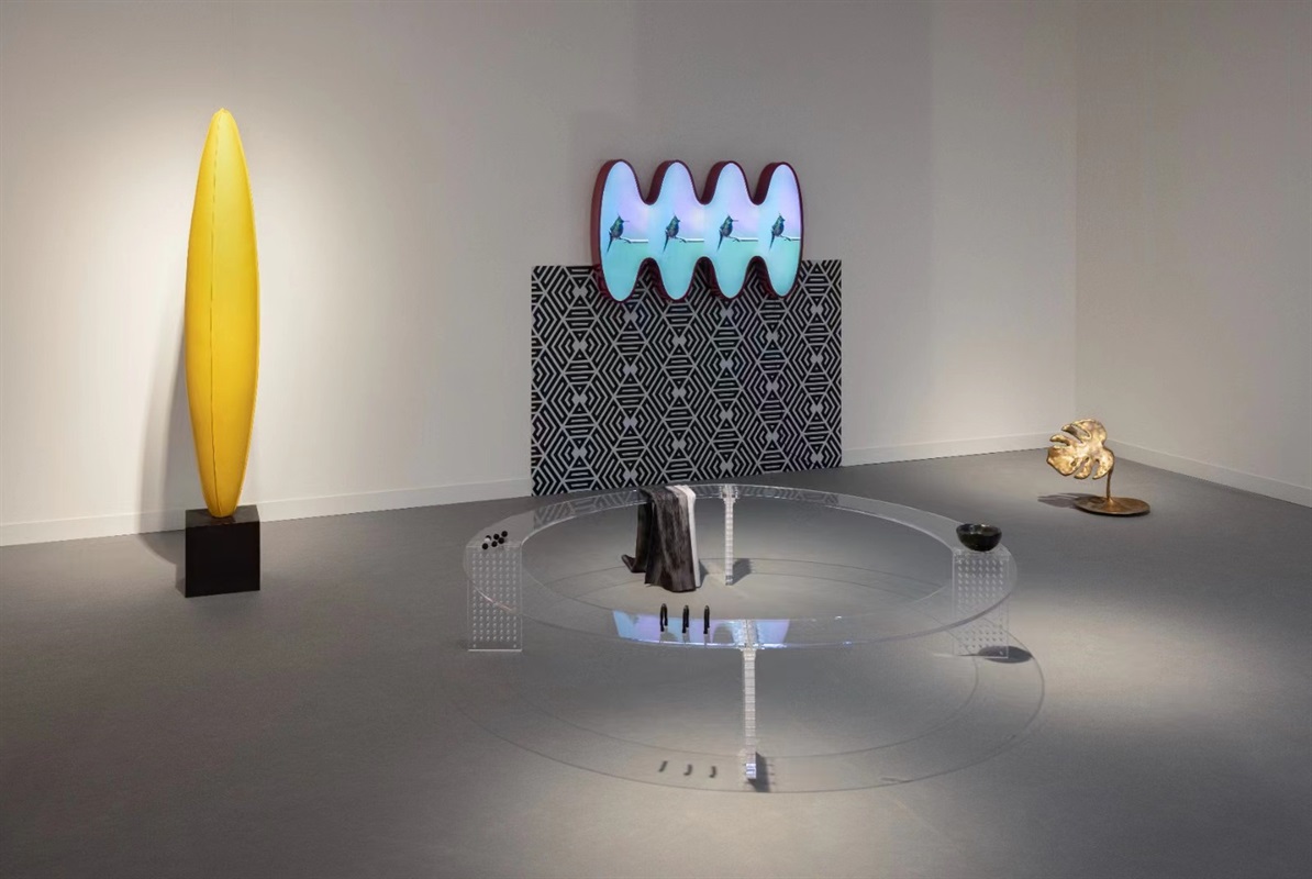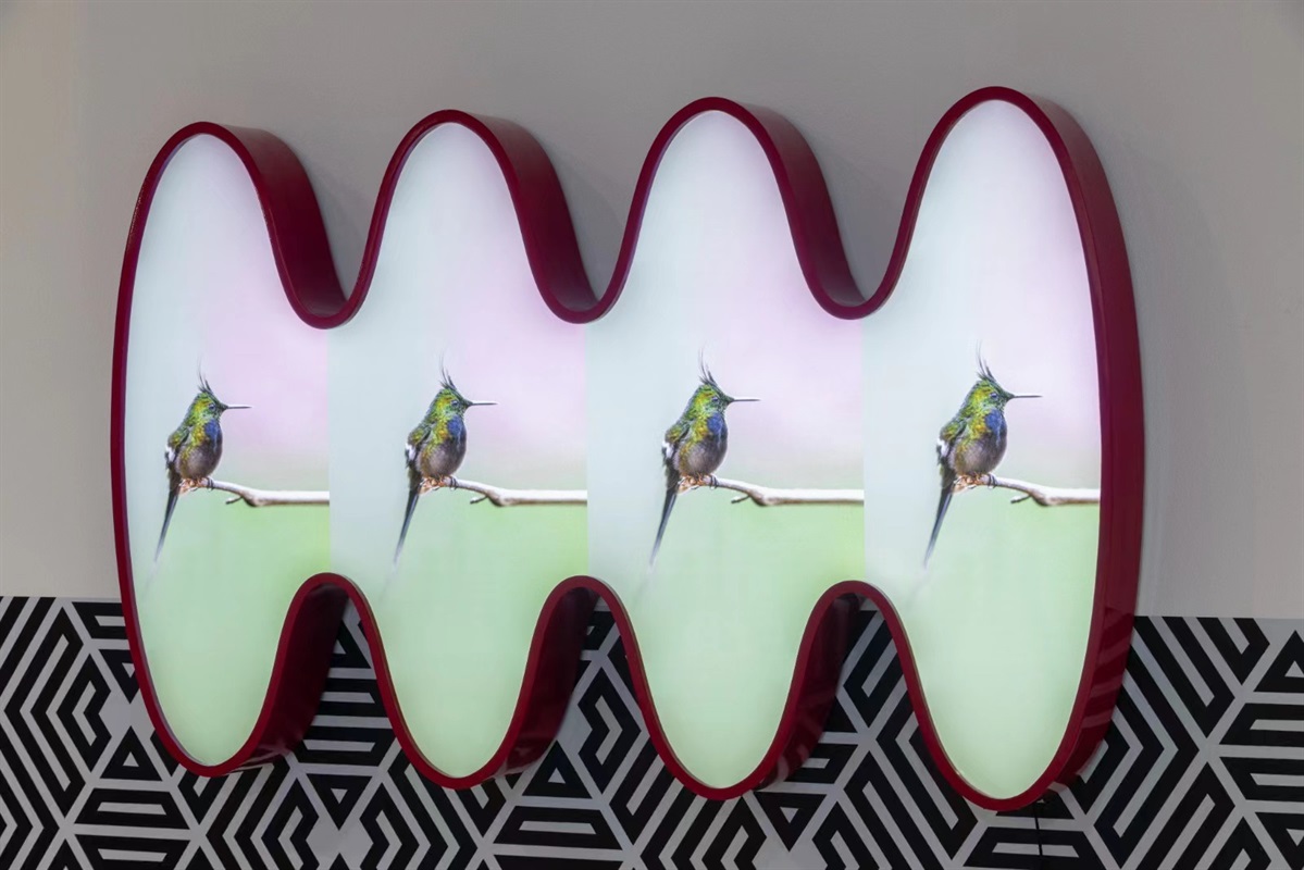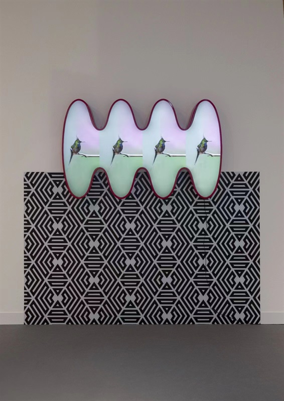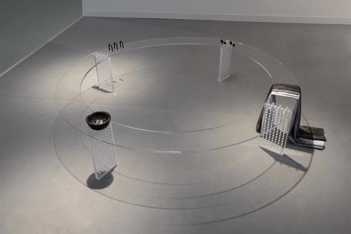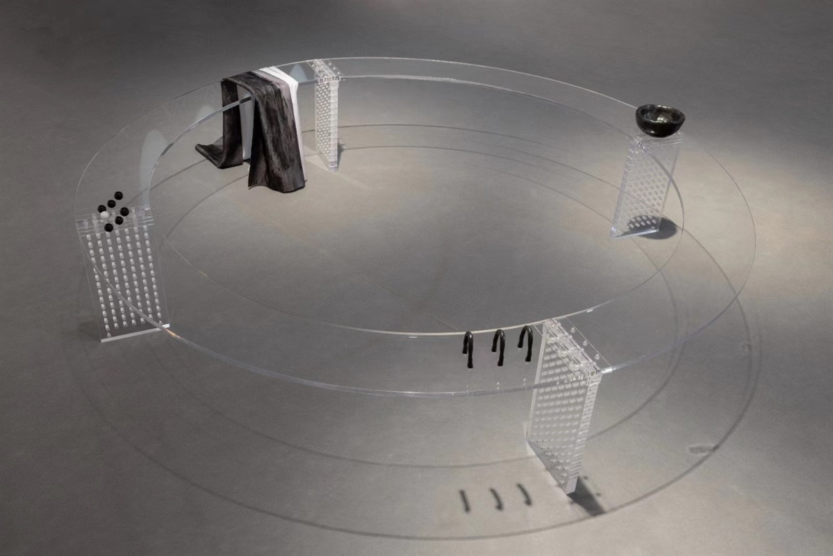 娜布其在此次倫敦弗里茲為形似家居物件的雕塑作品安排了角色,進一步戲劇化了諸多能動客體之間的關係。位於展位中心的《No.3-No.7(亞克力桌面和碗及其他)》是一張透明的圓形桌子,上放有材質各異的小型生活物件。或堅硬或柔軟的物件指示了在桌子周遭展開的活動,也指示了一種作為組織原則存在的生活方式,這種生活方式催生亂序、無端的情節發展,以及貌似隨性的雕塑性姿態。《No.1(帶有4隻鳥的燈箱)》在鋸齒型燈箱上重訪了藝術家近年常使用的飛鳥意象,持續探索了雕塑及圖像形式的互動、互惠或互相構陷的關係。