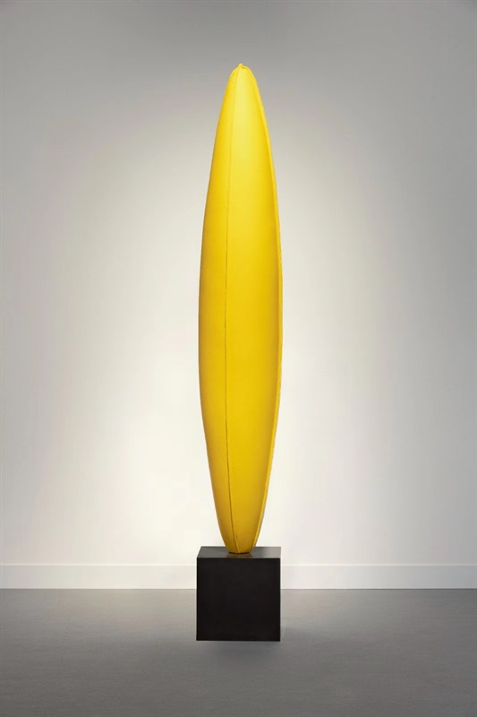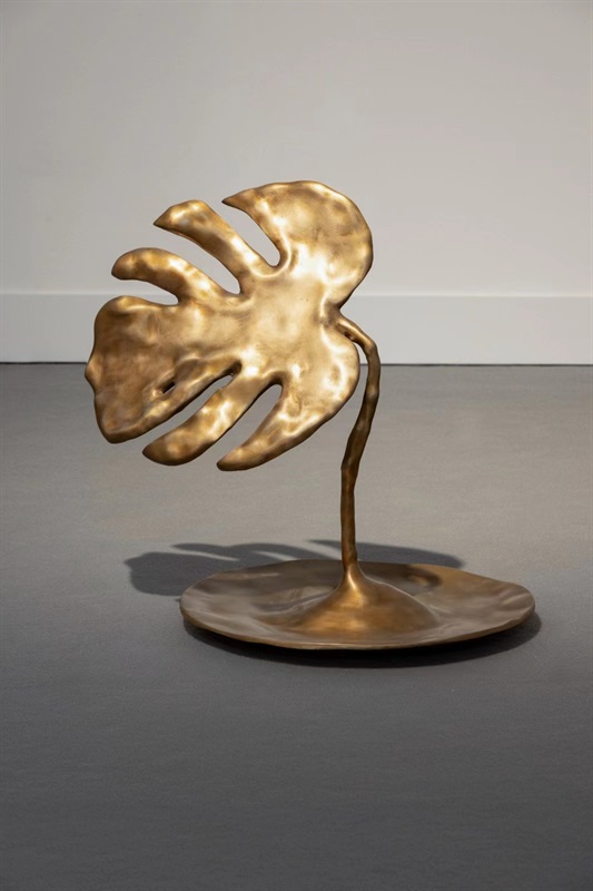 《No.8(裝在盤子中的龜背竹)》是此次展覽中唯一一件以娜布其長期青睞的青銅材料鑄成的作品。作品既讓人想起「幽靈,皮膚,居所」中的「化石」系列落地燈雕塑作品,也讓人想起藝術家更早期時純手工捏製創作的青銅雕塑作品。最後,出離巨大、鮮亮的橢圓雕塑《No.2(黄色皮革雕塑)》展示了娜布其在物質層面重塑家居空間的傾向:這一軟質反圖騰是展覽中唯一純粹抽象、無功用的物件,漂浮著,邀請人前來摩挲。作品凝聚了娜布其戲劇性家居環境的身體經濟,完整地揭示了眾多作品既是道具又是演員的雙重特質。