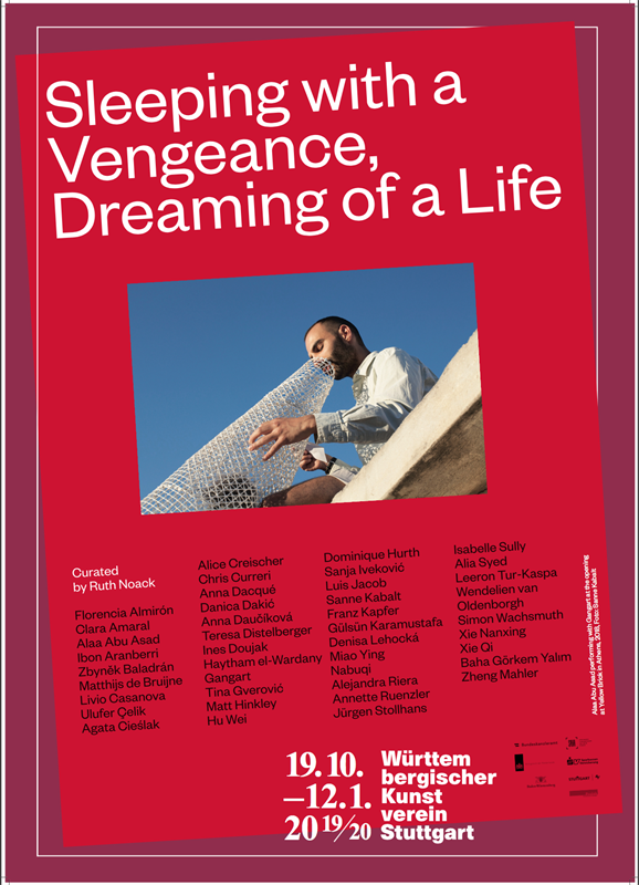 Begun in 2018 as a series of exhibition sketches, supported jointly by the smallest of institutions, by the curator and the artists who themselves contributed sketches, time, and know-how, Sleeping with a Vengeance, Dreaming of a Life continually evolves with each iteration. At each station, new sketches are added and old ones further fleshed out. A selection of works is now being fully realized in Stuttgart. This is not a classic traveling exhibition, but a work in progress. It changes with each respective location and its condi- tions. It learns from people and from the works of art. Within this open framework, we ask: Can sleep be reclaimed from the clutches of late capitalism? Can it gain subversive force? Can the acts of sleeping and dreaming be imagined as a resistant political deed? Would the sleeper be able to dream up a better life,